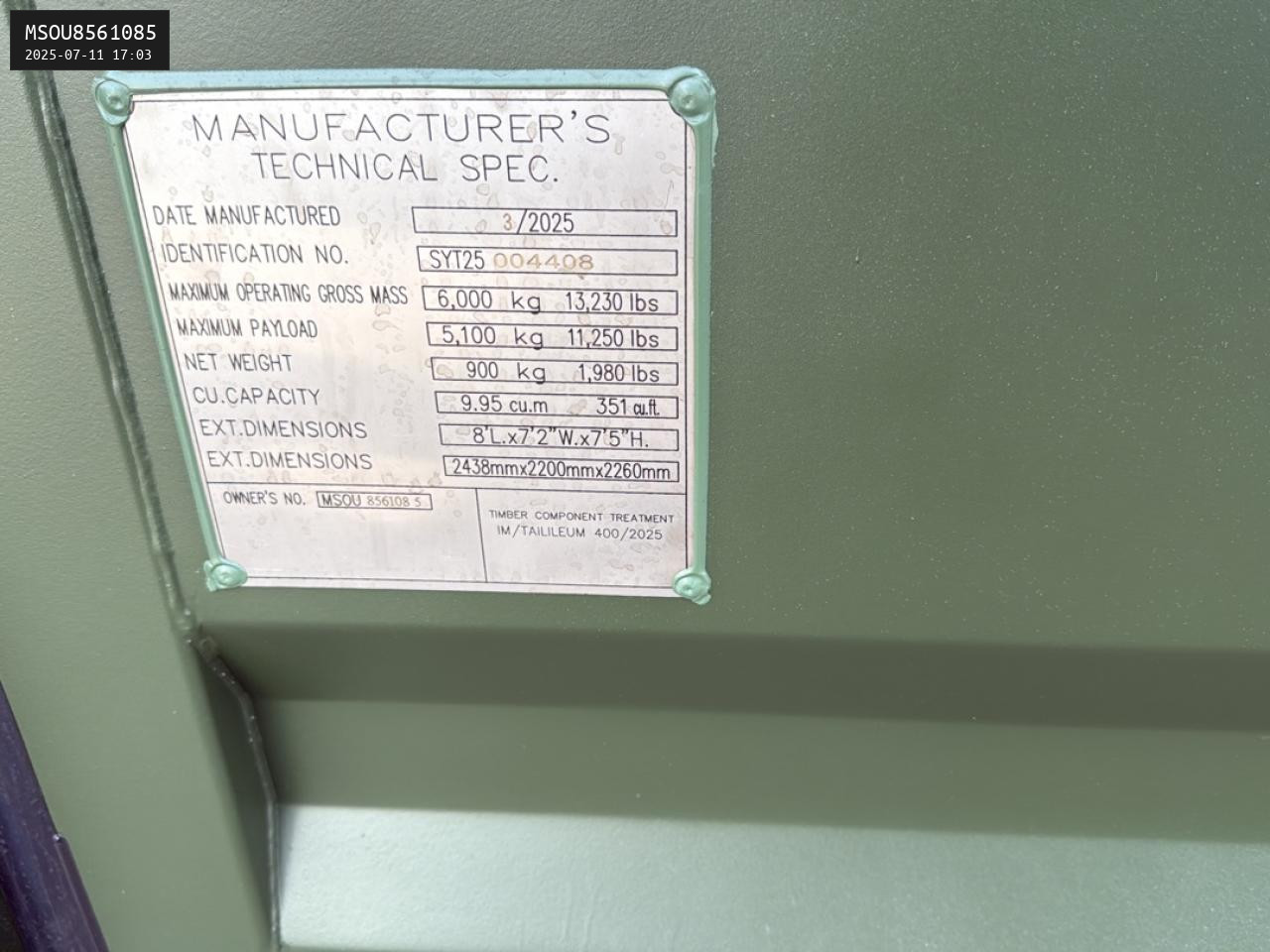 Stabile Stahlrahmenkonstruktion, Dach-, Seiten- und Stirnwände aus vollverschweißten Trapezblechen, große Container-Doppeltür mit Verriegelungen, Holzboden.